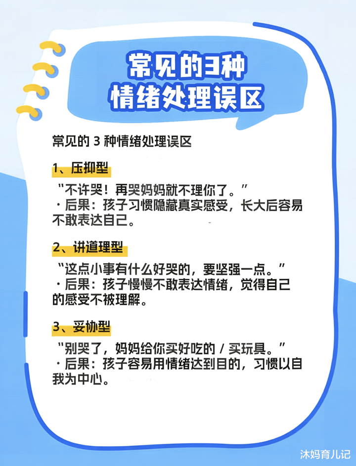 前几天,我看到一张图,列出了三种常见的情怀处理误区。第一种是“压抑型”,如“再哭我就不要你了”。这话虽奏效快,但孩子会荫藏情怀,躲闪贫窭。第二种是“讲真谛型”,如“这点小事有什么好哭的”。对孩子来说,摔坏玩物或被抢零食是天大的事,咱们却忽略了他们的需要——被交融和遴荐。第三种是“协调型”,如“别哭了,姆妈给你买厚味的”。这会让孩子认为哭闹能求仁得仁,性格变得轻易。