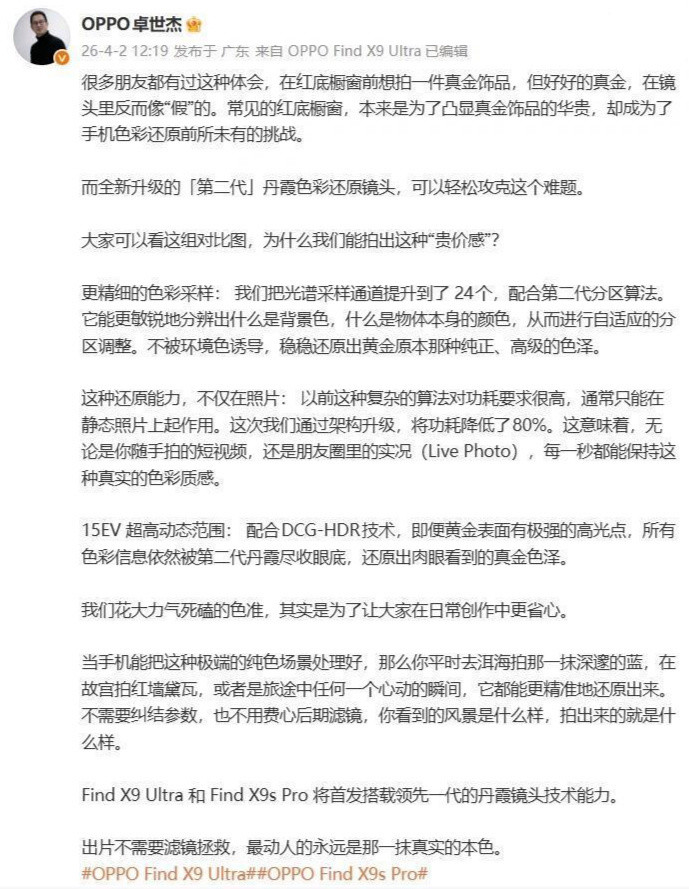 日前, @OPPO卓世杰 晒出了一组拍照样张,并配长文详解了这组样张。据其称,“好多一又友齐有过这种体会,在红底橱窗前思拍一件真金饰品,但好好的真金,在镜头里反而像“假”的。常见的红底橱窗,本来是为了突显真金饰品的重生,却成为了手机色调复原前所未有的挑战。
