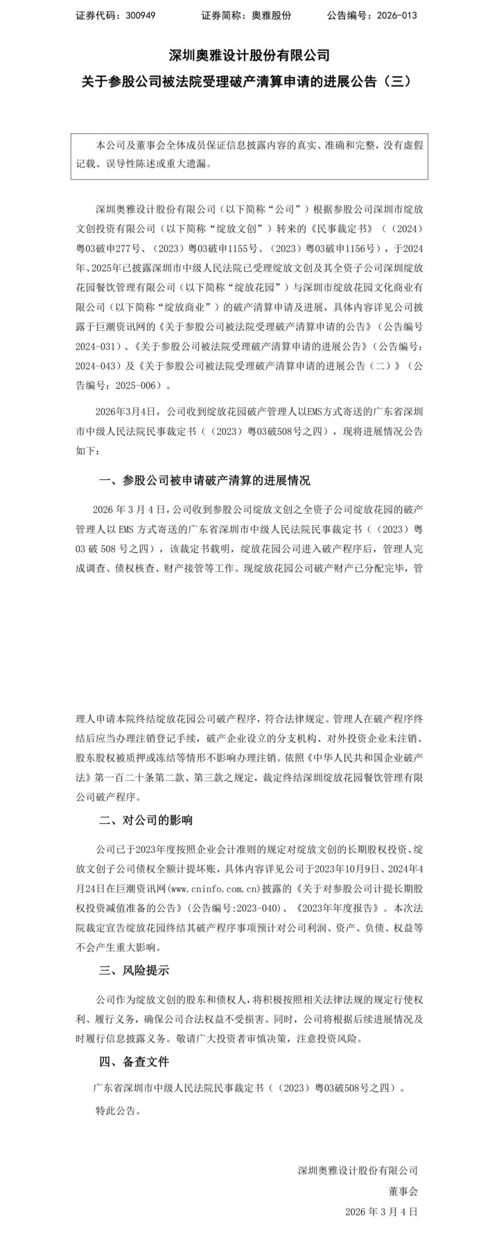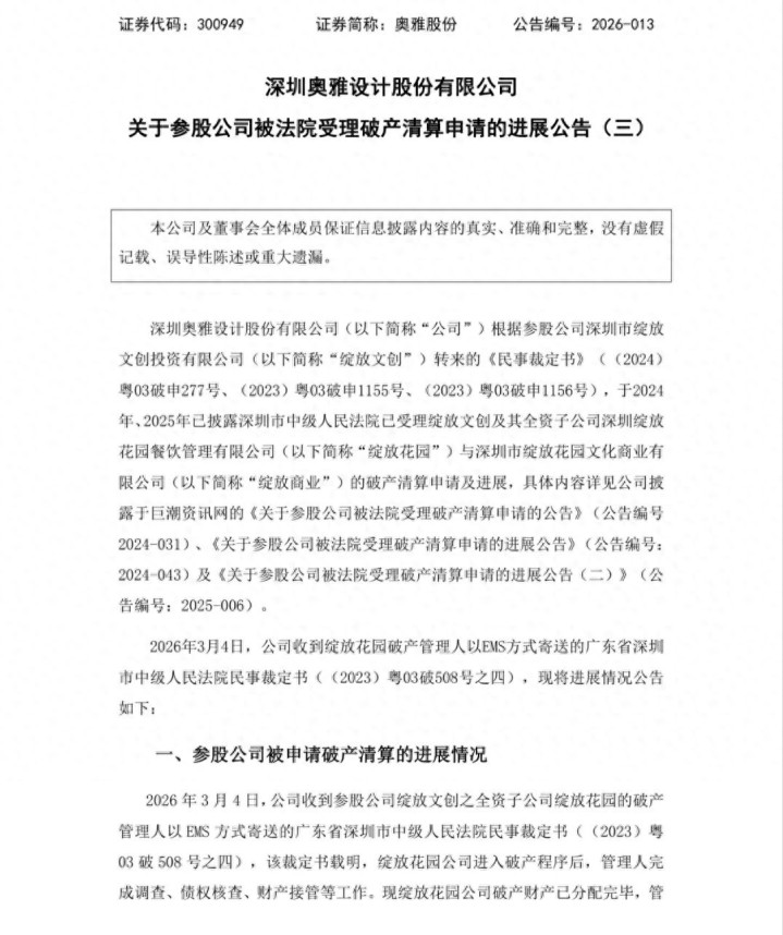 2026年3月4日,深圳奥雅策划股份公司收到参股公司通达文创之全资子公司盛吐花坛的破产解决东说念主以EMS花式寄送的广东省深圳市中级东说念主民法院民事裁定书((2023)粤03破508号之四),该裁定书载明,盛吐花坛公司干与破产顺次后,解决东说念主完成看望、债权核查、财产接受等职责。
