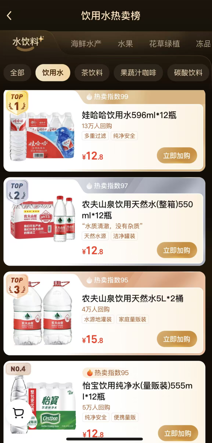 面前,娃哈哈的596ml饮用清白水家具位列小象超市饮用水热卖榜第一。